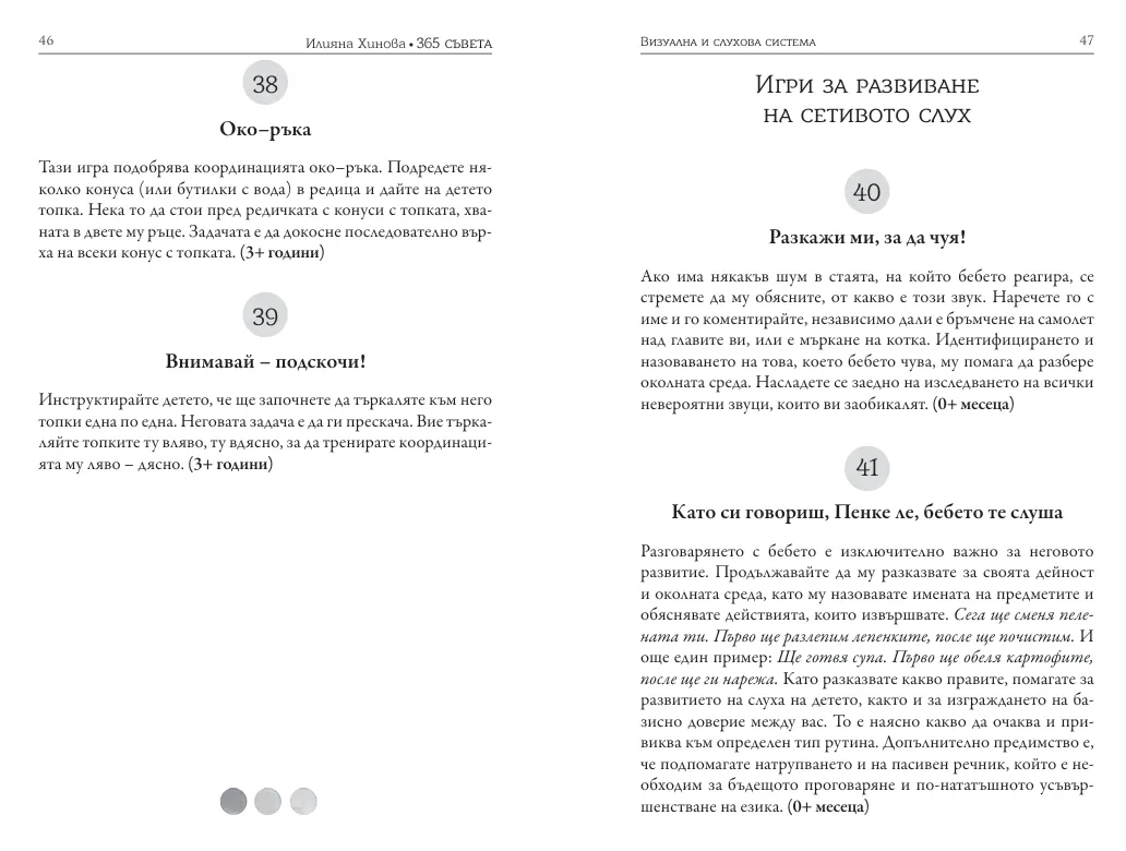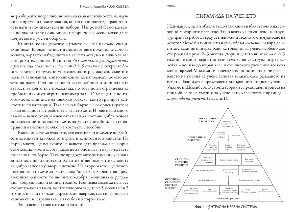 Всички упражнения, дейности и игри, поместени в книгата, следват философията на сензомоторното развитие, представена от пирамидата на ученето и следват естествените нужди при порастването на всяко дете, така че да се прилагат със съответните вариации от майки на деца от 0 до 5 години.